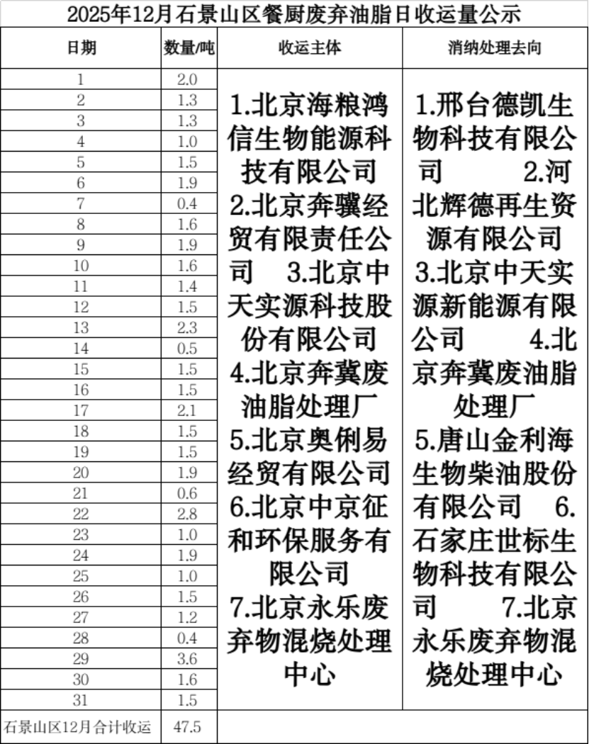 石景山区餐厨废弃油脂规范收运工作于2017年9月15日正式启动,我区确立北京海粮鸿信生物能源科技有限公司、北京奔骥经贸有限责任公司、北京中天实源科技股份有限公司、北京奔冀废油脂处理厂、北京奥俐易经贸有限公司、北京中京征和环保服务有限公司、北京永乐废弃物混烧处理中心,负责我区餐厨废弃油脂的规范收运工作。现将2025年12月份日收运量公示如下: