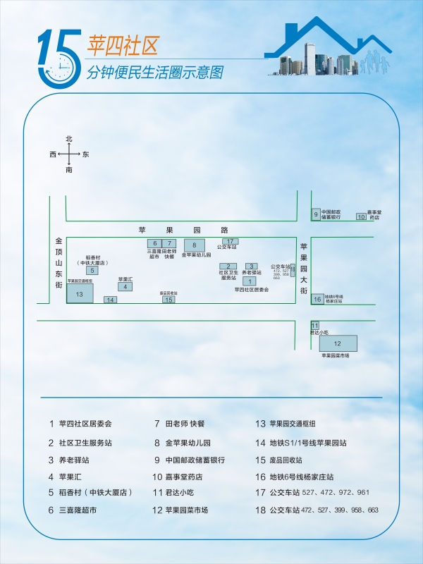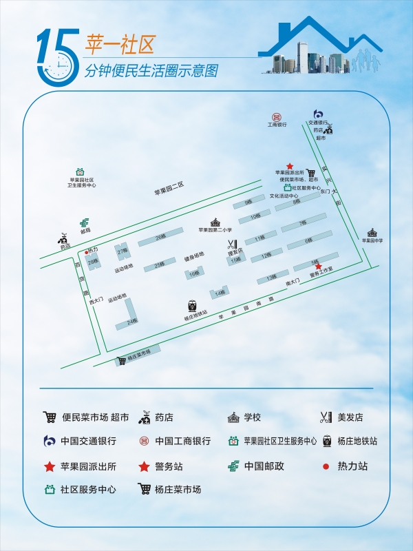 苹果园街道地处石景山区北部,东边新四平台与海淀区搭界,南抵京门铁路与八角、古城街道相邻,西起礼王坟、金顶山一线、与金顶街街道连接,北依京西翠微、青龙诸峰与海淀隔界。辖区面积13.13平方千米,下辖社区22个,常住人口9万余人。