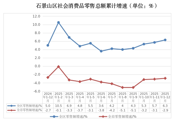 2025年,全区实现社会消费品零售总额379.8亿元,同比增长6.3%。分消费形态看,实现商品零售345.9亿元,同比增长6.7%;餐饮收入33.9亿元,同比增长2.2%。