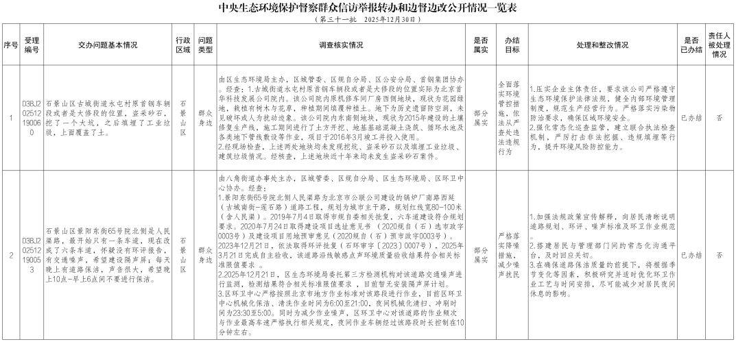2025年12月20日,中央第一生态环境保护督察组向北京市交办第三十一批群众信访举报件33件,涉及石景山区2件。现按要求向社会公开本区该批次《中央生态环境保护督察群众信访举报转办和边督边改公开情况一览表》(见下表)。