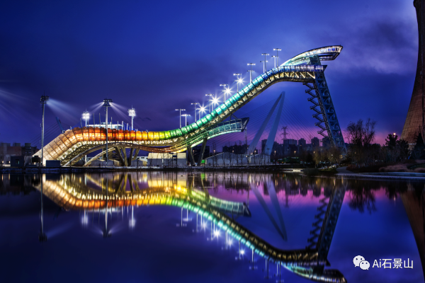 首钢滑雪大跳台的壮阔之美,和它所处的环境分不开。大跳台位于首钢园群明湖畔,身姿倒映在平静的水面上,视觉得到延伸,现实和镜像的对称之美,让人赏心悦目。同时,在群明湖上,还专门设置了一些开放空间,可以让游人从不同角度欣赏大跳台的美。