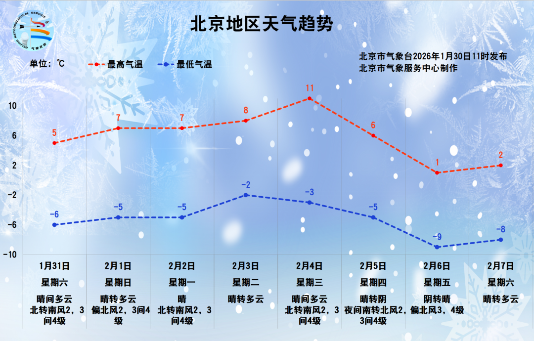 北京市气象台30日11时发布:今天下午阴,大部分地区小雪或零星小雪,城区零星小雪为主,偏南风二三级,最高气温1℃;夜间阴转晴,南转北风二三级,最低气温-6℃。今天我市有弱降雪,气温下滑,体感阴冷,请注意防寒保暖及出行安全。